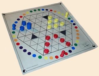 Bin'Fa (Hexagony) is a game of strategy for 2 to 6 players, each of whom controls an army of twelve units. In multiple army games, each player controls either two or three armies. The object of the game is to capture the opposing army units by surrounding them, thereby removing them from play. The winner is the player whose army units remain on the board after all opposing units have been removed. ~ More